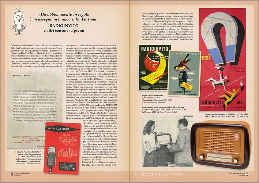 100 Anni di Radiodiffusione in Italia - Seconda Parte Il 2024 è stato un anno particolarmente importante per la storia della radio, tanto che lo oserei definire un allineamento siderale per le celebrazioni marconiane. Sono date importanti, che nello svolgersi delle pagine consunte del calendario perenne, portano alla memoria le tante ricorrenze che si sono succedute nel corso degli anni. A partire della prima pubblicazione di ARM (maggio1993) scorrono nei ricordi tanti momenti che voglio condividere con voi che foste partecipi e attori di quegli eventi. Fra le prime si affacciano le ricorrenze del 1995 con le rievocazioni del primo centenario della trasmissione del segnale radio oltre la collina dei Celestini, celebrato con la collaborazione della RAI, promosso dalla Scuola Italiana Design e da Tecno Padova, azienda speciale della Camera di Commercio di Padova. Per l’occasione fu realizzata una mostra e un catalogo. L’evento si svolse durante la tradizionale Fiera Campionaria di Padova e il titolo fu “Cento anni di radio e design”, ebbe grande risonanza tanto che nello stesso anno fu ripetuto a Cortina d’Ampezzo (BL) e successivamente la mostra sbarcò a Pechino. Ancora nel 1995 ebbe luogo a Milano, al Museo Nazionale di Scienza e Tecnica “Leonardo da Vinci”, la commemorazione “Marconi: una comunicazione lunga un secolo” che vide il suo momento di massimo interesse nell’incontro fra Renzo Arbore e i ragazzi del Politecnico di Milano avvenuto nell’auditorio del Museo. La mostra composta di rari cimeli è stata rappresentata nel volume omonimo. Queste furono le prime, ma ne seguirono molte altre, secondo la cadenza delle conquiste tecnologiche e degli eventi. Per ricordarli tutti manca lo spazio, ma sfogliando le annate della rivista tornano alla mente tutte, presenti, vive, ricche di immagini e ricordi. “La radio è suono: è la macchina dei suoni!” così viene definita da Franco Monteleone, illustre scrittore e storico della comunicazione che per molti anni fu un dirigente RAI. Quando ci siamo posti l’obiettivo di dedicare un numero monografico della rivista per celebrare i 100 anni di radiodiffusione in Italia, abbiamo dovuto scartabellare una mole elevata di documentazione archiviata in tanti anni di pubblicazioni e ci siamo resi conto che un solo numero di ARM non sarebbe stato sufficiente nemmeno a contenere una sia pur strigata sintesi. Così si è giunti alla definizione di dedicare all’argomento ben due numeri. È stata una evocazione magica, un suggestivo attraversamento di documenti, magari a tratti lacunosi, ma comunque essenziali per rappresentare una storia eccezionale lunga un secolo, ricca di sorprendenti iniziative e scoperte che, con piacere, condividiamo con voi. Le ricorrenze citate poco sopra sono state, per quanto ci compete, le prime della nostra avventura editoriale, ma parafrasando quanto sostenuto da uno dei più grandi geni del nostro rinascimento: “L’acqua che tocchi de’ fiumi è l’ultima di quella che andò e la prima di quella che viene” (Leonardo da Vinci). Questo per significare che memorie sulla radiodiffusione vennero celebrate prima, ne furono commemorate dopo e nel tempo ne verranno ancora altre. Intanto hanno preso forma musei istituzionali e privati, sono sorte collezioni di grande interesse e rilievo, la conoscenza della radio, sia come apparecchio tecnologicamente evoluto che come mezzo di comunicazione e interesse culturale collezionistico, si è altresì diffuso nel mondo. Siamo orgogliosi di sostenere che Antique Radio Magazine ha avuto in questi decenni di pubblicazione, con il sostegno dei numerosi collaboratori e degli affezionati lettori, un ruolo di particolare rilievo. Rivolgiamo un sentito ringraziamento a quanti ci sono compagni in questo avventuroso viaggio denso di sorprese e di emozioni. Ad maiora semper!